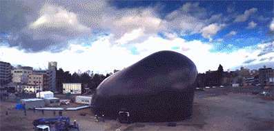 因为松岛前不久遭受了地震和海啸,人们希望用音乐减淡伤痛使民众重拾希望。于是,他们用涂层聚酯作为建筑表面材料,像吹糖人儿一样,建造了这座造型奇异的移动音乐厅。人们要在这里表演“古典音乐、爵士乐、舞蹈、多媒体项目以及日本传统的歌舞伎演出”。