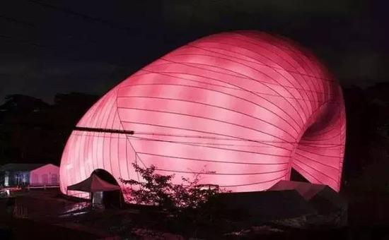 一位艺术家和日本著名建筑设计师矶崎新共同创造了这个可移动的充气音乐厅,它有个耐人寻味的名字:Ark Nova——“新方舟”,这个名字寓意为人类面对灾难时的希望。这位印度裔英国艺术家叫Anish Kapoor(安尼施·卡普尔), 他常常在简洁曲形造型上饰以鲜艳的色彩并融合东西方的艺术气质,这使他成为一位备受世界瞩目的艺术家。