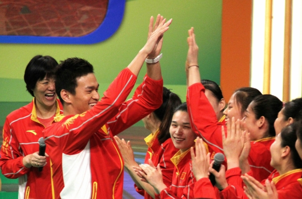 图为游泳运动员孙杨(左二)和女排队员击掌。(8月28日摄)