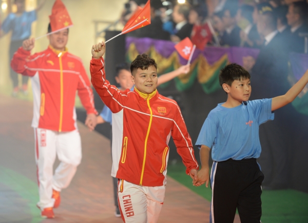 图为举重运动员龙清泉(前左)在“奥运精英约定你”综艺活动中入场。(8月28日摄)