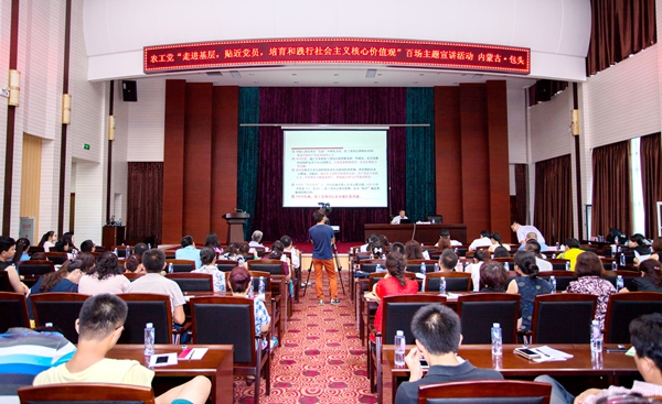 2016年8月20日下午,农工党“走进基层,贴近党员,培育和践行社会主义核心价值观”百场主题宣讲走进内蒙古包头。宣讲团成员由农工党中央常委、农工党中央研究室主任游宏炳,农工党广东省委会常委、中山大学第一附属医院博士生导师秦鉴,内蒙古自治区政协委员、内蒙古自治区血液中心献血办主任陶迎春组成。农工党内蒙古区委会副主委、包头市委会主委张伯群出席宣讲活动并致辞。农工党中央宣传部信息处处长谢英伟主持报告会。张伯群在致辞中强调,各位党员要珍惜难得的机会,深刻认识、准确把握社会主义核心价值观的科学内涵和实践要求。农工党包头市委会将组织全市党员继续深入推进学习实践活动,把培育和践行社会主义核心价值观贯穿于思想建设、组织建设、机关建设、履行职能和社会服务的各项工作中,为推动包头市经济社会发展贡献力量。