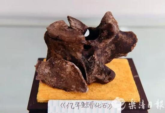 “这块鲸骨化石有上亿年了,我刚拿到手的?!毕ρ粑飨拢潞枰吹蕉铰胪放纳闳章?。看到渔民网中的这块鲸骨化石,章鸿耀喜出望外,经过交流,渔民 把鲸骨化石送给了他。这块鲸骨化石如今与三叶虫化石、鱼化石、海螺化石、贝壳化石、鹦鹉螺化石、青蟹化石和猫科动物的牙齿化石等装裱后一起摆放在展柜里。