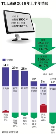 此后8月24日,TCL集团发布了2016年上半年财报。公告显示,TCL通讯上半年营收92.8亿元,同比下降11.8%;净利润1900万元,同比下降94.7%。