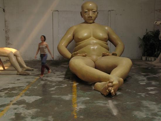 这个系列的另一件大型作品《敞开者》被艺术家视作整个命题的终结。和《你的身体》相对应,这是一位坐在地上的女人,依旧是光头、没有社会身份,依旧 是松弛的乳房、堆积的肚腩赘肉,甚至体量更为庞大:高达三米六、长达六米一。可是整个人的姿态与面目都显示出与早先不同的平和感。