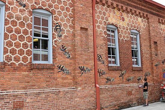 为了唤起人们对小小蜜蜂生存窘境的关注,纽约艺术家Matt Willey发起了“为了蜂巢”倡议活动。这个项目可谓雄心满满:他要在全世界各地的墙上画出五万只蜜蜂。这个五万的数目可不是自己突发奇想随意定下的, 而是来源于一个健康的蜂巢需要五万只蜜蜂来维持的科学事实。通过艺术和想象,该项目旨在赞美小蜜蜂所完成的不可思议的巨大成就,以及呼吁人们对蜜蜂糟糕生存状况与种群数量减少现象的关注。