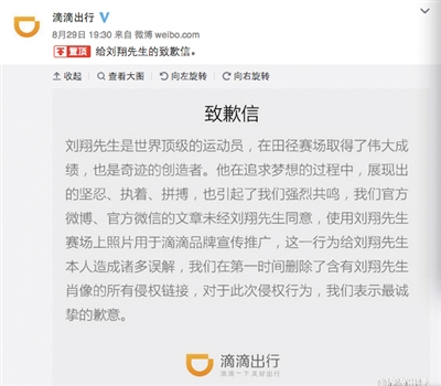 滴滴承认侵权 向刘翔表达“最诚挚歉意”