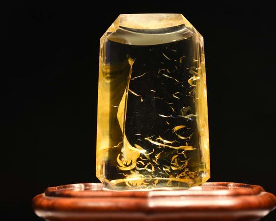 晶莹剔透、颜色艳丽,是水晶内唅物观赏石《鱼跃龙门》达到宝石级的必要条件。纯净无瑕、细腻温润的晶体与纯正明亮的金黄色图像,反差强烈、对比鲜明。金黄色的物质透过光线在晶体内反射、析射,诱发出迷人的色彩。块面颜料充实了生命的质感与肌理,演译出鲜活的运动美感?!吧褪帐酢绷哒妫钊讼?!