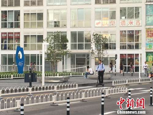 北京国贸附近有人骑电动滑板车过马路。汤琪 摄