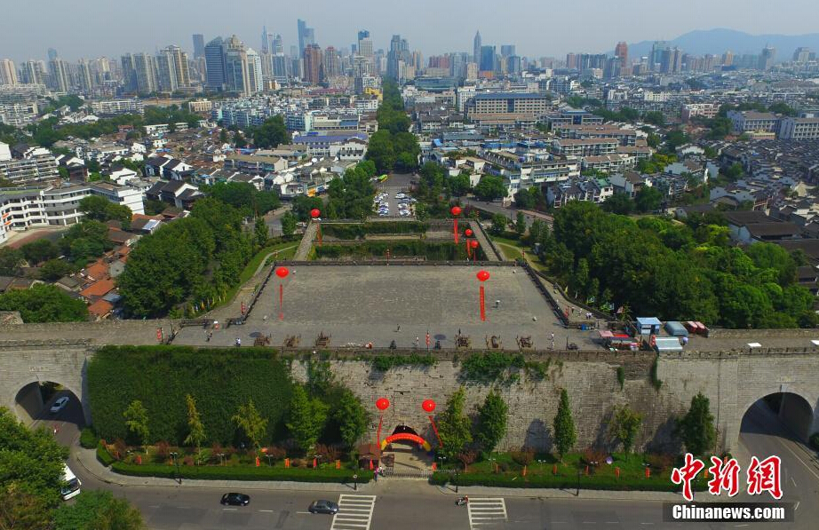 9月5日,南京明城墙650周年生日会在中华门瓮城举办,大批9月5日出生的市民赶来一起切生日蛋糕,分享快乐。据悉,为纪念南京明城墙肇建650周年,南京将融入科技、音乐、设计的元素,开展创意城墙、品读城墙、对话城墙、亲近城墙等一系列的活动。图为航拍南京中华门城堡。 中新社记者 泱波 摄