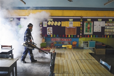 当地时间9月4日,马来西亚吉隆坡,一名工作人员在当地一家学校放学后对教室进行灭蚊处理。 图/视觉中国