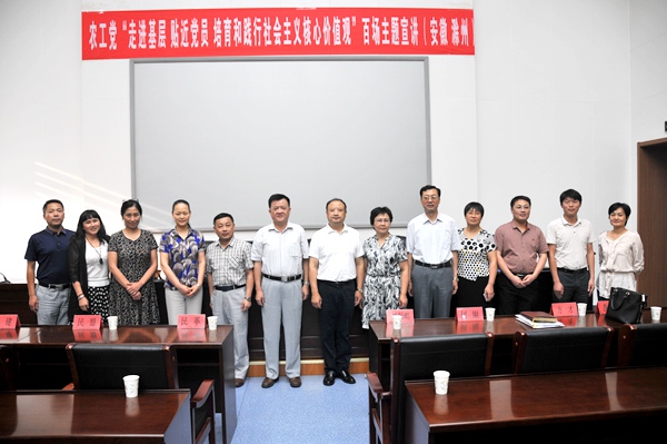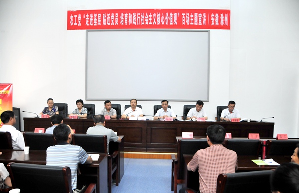 2016年9月2日,农工党“走进基层、贴近党员,培育和践行社会主义核心价值观百场主题宣讲”在安徽省滁州市举办。农工党青海省委会专职副主委何刚、农工党海南省委会专职副主委毕华作宣讲报告。农工党安徽省委会专职副主委方才、农工党滁州市工委主委査镜波出席宣讲会。中共滁州市委统战部副部长卓海燕、覃蔚及滁州市各民主党派负责人等应邀出席宣讲会。宣讲会由农工党中央宣讲团领队刘保明主持。査镜波、卓海燕分别致辞。査镜波在致辞中代表农工党滁州工委对宣讲团的到来表示热烈欢迎,同时向宣讲团详细介绍了农工党滁州工委的有关情况,并且要求与会同志认真聆听宣讲,不断增强中国特色社会主义道路自信、理论自信、制度自信、文化自信,积极培育和践行社会主义核心价值观,切实提高履职尽责能力和水平,为滁州的经济社会发展作出新贡献。卓海燕在讲话中详细介绍了滁州经济社会发展状况和统战工作情况,同时希望以本次宣讲活动为契机,进一步深化思想政治共识,不断提高政治把握能力、参政议政能力、组织领导能力、合作共事能力和解决自身问题能力,为全面建成小康社会发挥积极作用。