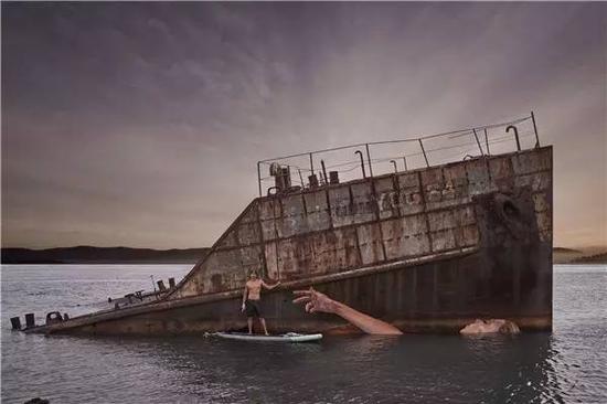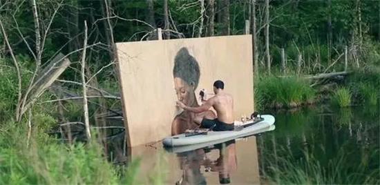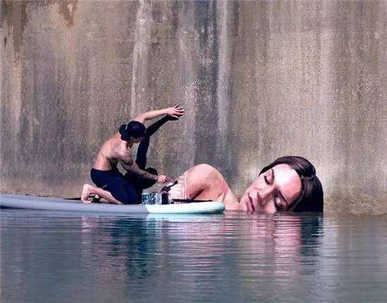 找不到合适的“画板”也不怕,Sean会将巨型画板立在水中,继续在其上作画。
