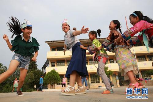 9月6日,在广西柳州市融水苗族自治县大年乡高马村小学,吴忠艳(左一)、梁?;唬ㄗ蠖┖秃⒆用亲鲇蜗?。今年24岁的梁?;缓?3岁的吴忠艳是广西柳州市融水县城人,她们2005年大学毕业后主动申请回到县里的大年乡高马村小学担任特岗老师。大年乡高马村小学距离县城150多公里,是全县最边远的村小之一,学校学生中大多是留守儿童。梁?;缓臀庵已蘩醚O钟谐〉?,创办了“留守儿童之家”,设有手工、武术、舞蹈、象棋、唱歌等兴趣班,以及小小针线角、小小医疗站等服务项目,丰富了孩子们的课余生活。高马村小学的其他老师也逐渐加入到“留守儿童之家”,为孩子们做一些力所能及的服务工作。梁?;缓臀庵已拚舛浴敖忝没ā钡母冻龅玫搅松缁岬娜峡桑撬竦?016年第二季度广西柳州市“最美柳州人”的称号。新华社发(龙涛 摄)