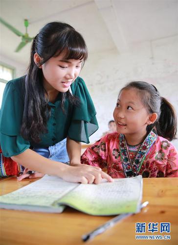 9月6日,在广西柳州市融水苗族自治县大年乡高马村小学,吴忠艳在辅导一名留守儿童学习。