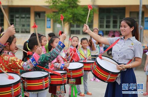 9月6日,在广西柳州市融水苗族自治县大年乡高马村小学,吴忠艳指导孩子们练武术。