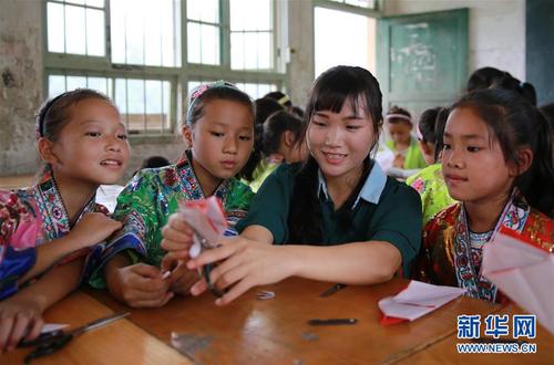 9月6日,在广西柳州市融水苗族自治县大年乡高马村小学,吴忠艳在教孩子们学习剪纸。
