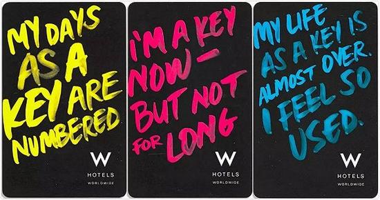 随着2014年9月那场苹果发布会的召开,用Apple Watch刷开酒店客房门的创想被提上了日程,发布会后,W酒店立马推出了一组三款房卡,分别用红、蓝、灰三色在黑底房卡上叙述“我的房卡使命即将终结?!币源讼煊ζ还频攴靠ㄏ麓锏乃佬塘?。