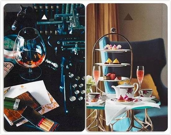 每家朗廷的背面都抹满了标志的粉色,正面则“云里雾里”地展现打字机、下午茶、珠宝和鲜花摆设等场景,但合在一起就会秒懂:共同点在于,他们都是“桌上风景”,这也顺势鼓励你拓展你的朗廷旅程,去探知下一家房卡的桌上会怎么堆?