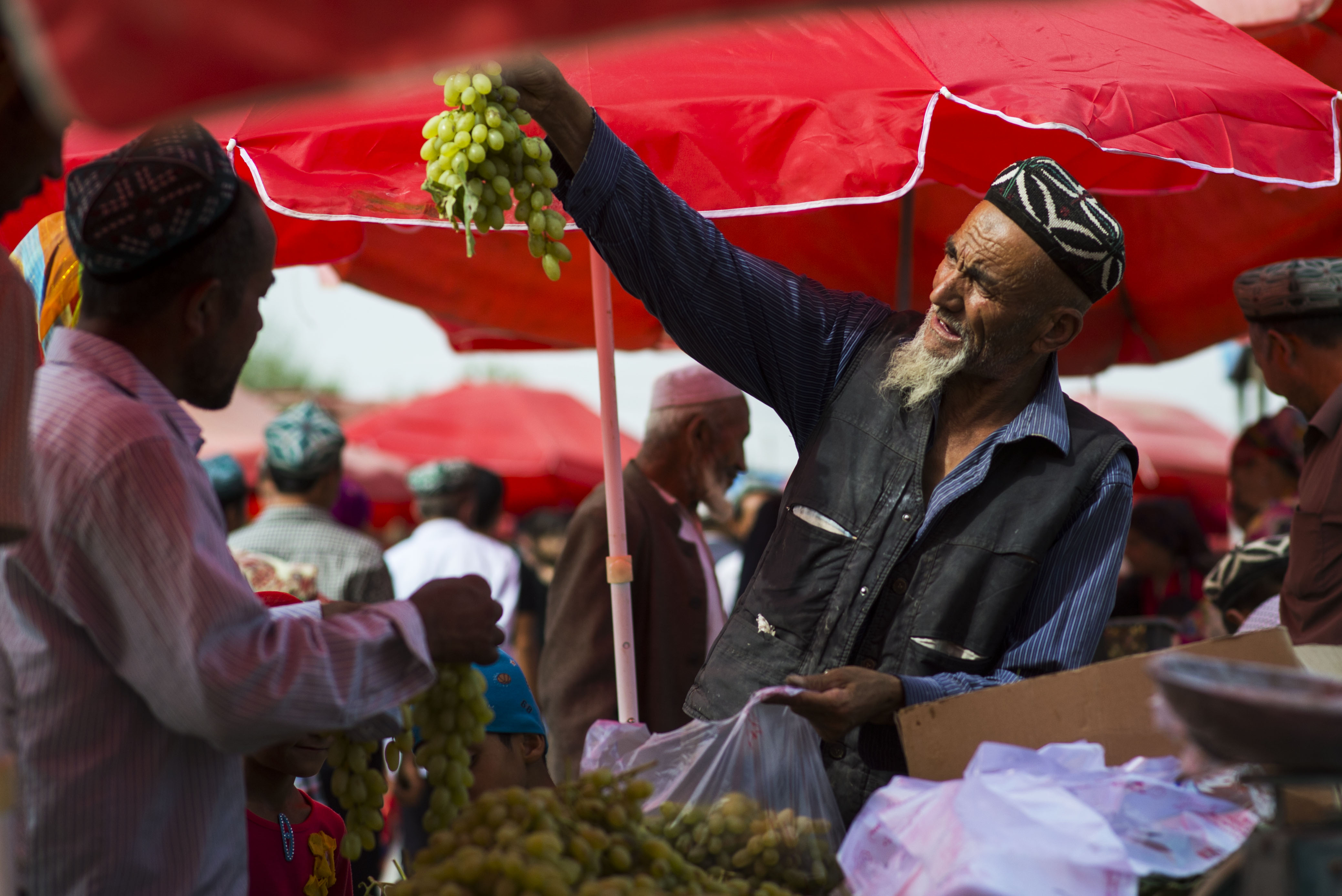 9月11日,新疆和田地区策勒县阿卜杜拉·艾迈尔大爷在巴扎上销售他自家种的葡萄。古尔邦节到来前夕,新疆各地穆斯林群众纷纷来到大巴扎上选购牛羊肉、干果和布料等物品,准备欢度这一传统节日。新华社记者 江文耀 摄