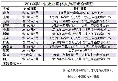 近日,随着江苏、安徽、广西退休人员基本养老金调整方案出台,记者统计了31个省市养老金调整情况,据不完全统计,目前至少有12个省份公布上调养老金,同时又很多地区的养老金总体水平超过6.5%。