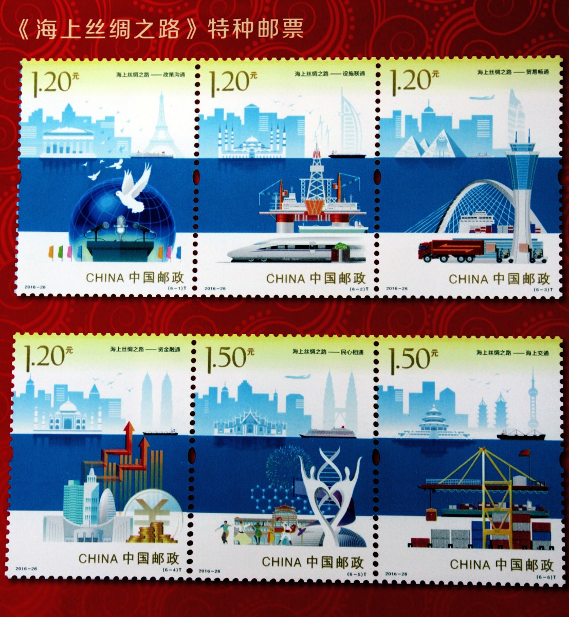 日前,呼和浩特晚报记者从内蒙古集邮业务局了解到,9月10日中国邮政发行了《海上丝绸之路》特种邮票,全套六枚,小全张一枚。邮票图案内容分别为:政策沟通、设施联通、贸易畅通、资金融通、民心相通、海上交通。前四枚邮票面值为1.2元,后两枚邮票面值为1.5元,总面值7.8元。