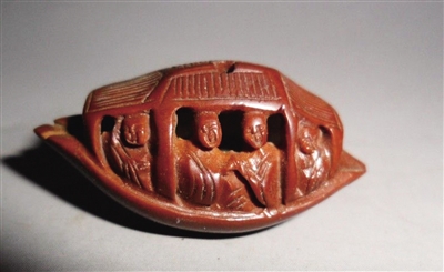 呼和浩特市收藏家协会会长张宝舰:这件收藏品为核雕,在材质上属于橄榄核,年代为清代。核雕在我国古代有着悠久的历史,明清时核雕工艺达到鼎盛时期?!逗?舟记》里所描绘的明代王叔远首创以橄榄核雕制“东坡夜游赤壁”之舟,就是其中之一。而这件收藏品也如《核舟记》里讲述的那件橄榄核雕刻作品一样,舟上舱轩 篷楫,什物俱全,镌刻的人物,精妙传神。