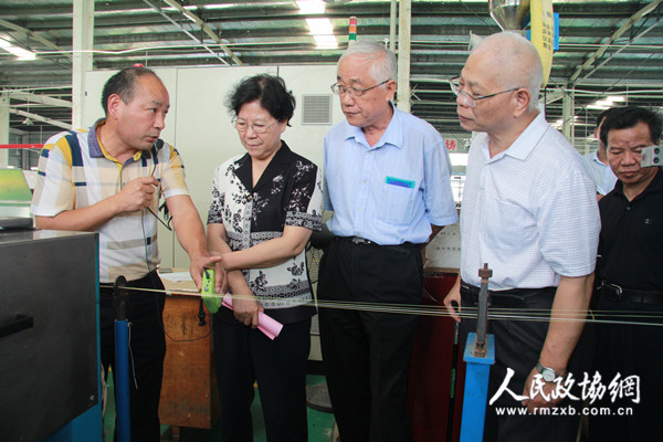 全国政协社法委副主任宋育英(左二)和全国政协委员李宏塔(左三)、王新宪在安徽牡东通讯光缆有限公司了解光缆制造流程。李木元 摄