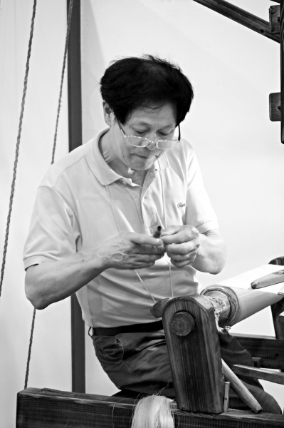 他不长于表达,即使是几十年伴随自己的身体记忆也不能流畅饱满地用言语呈现,加上浓重的南方方言,加上繁复专业的织造术语,坐在他面前,分辨他带来的信息抽丝剥茧般吃力。可当他坐上罗织机,一切的隔阂好像都不再是问题。见他轻拢慢捻抹复挑,从上万根丝线中准确清晰地找出一根断丝,魔术般快速地在断头处打个结,用胸前的小剪刀果断剪去结上的线头,手指一松,那根线带着平滑的结扣跳跃进万千丝海里,它断掉的生命被续接上,又欢快地流淌进织机“唧唧复唧唧”的歌唱中了。那一刻,是一种手艺人把技艺化在骨血里的美,美到使人落泪。