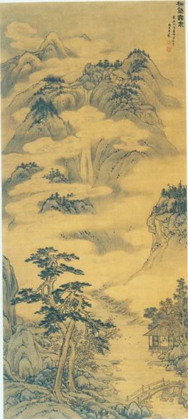 《山水图》轴:现藏于上海博物馆,纵327.9厘米,横106.8厘米,纸本设色?;彻憷钤?,气象万千。所绘高山耸峙,巨峰凌空,山头乱石累累,白云飘渺间一瀑布如白练飞溅而下,山底溪流蜿蜒曲折,两岸怪石嶙峋,丛树群生,青松茂密;溪流旁有木屋数间隐映于密树之中,屋内有人凭轩眺望山色。图中山石勾染,皴法多用秃笔中锋,枯树、苍松勾勒细致自如,所画木屋、人物虽小,却形神皆备,意趣横生。整幅画构图高远,秀逸古拙,意境冷峭幽深,笔法工细严谨,苍中带秀,平中求奇,静中寓动,色泽清新妍丽,别具神韵。