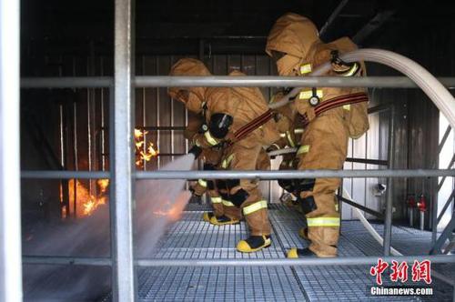 9月13日,中俄双方官兵进行舰艇损害管制交流和联合训练。图为中方参演人员进行灭火训练。