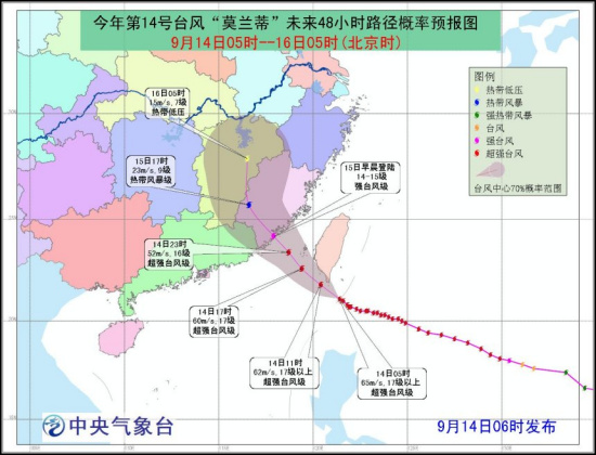 大风预报:14日08时至15日08时,南海东北部、巴士海峡、台湾以东洋面、台湾海峡、台湾沿海、福建沿海、浙江南部沿海、东海西部和南部将有7~10级大风,部分海域和地区风力有11~12级,“莫兰蒂”中心经过的附近海域和地区风力可达13~17级以上。