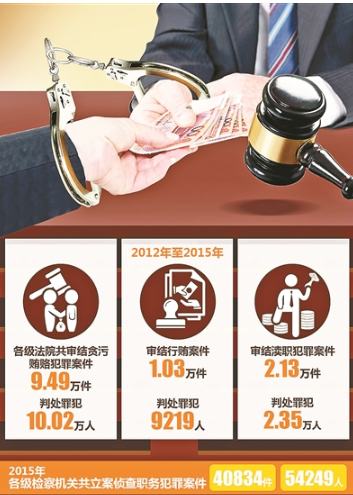 白皮书说,2015年,各级检察机关共立案侦查职务犯罪案件40834件54249人。2012年至2015年,各级法院共审结贪污贿赂犯罪案件9.49万件,判处罪犯10.02万人;审结行贿案件1.03万件,判处罪犯9219人;审结渎职犯罪案件2.13万件,判处罪犯2.35万人。