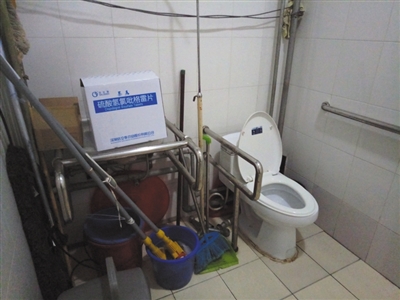 展览路医院无障碍卫生间,被保洁工具和杂物堆满。