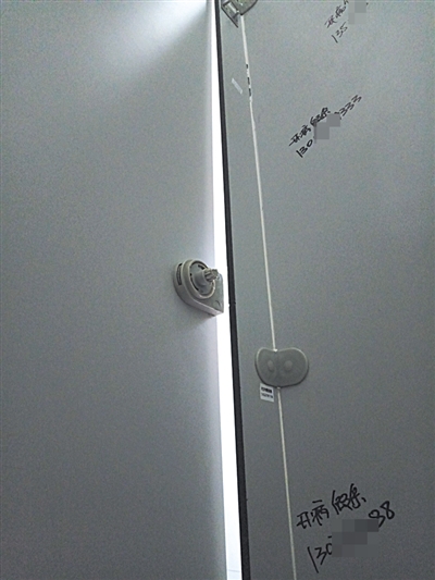 北京大学人民医院卫生间隔间门锁已坏,隔板上写满广告。
