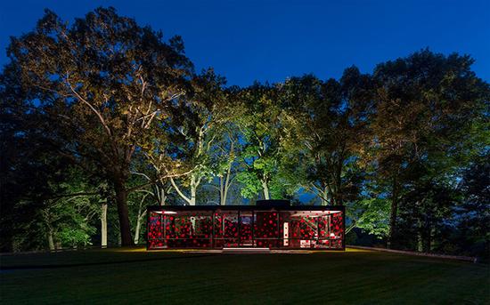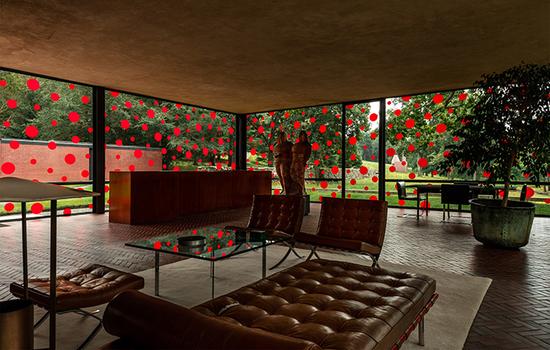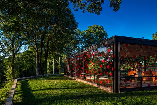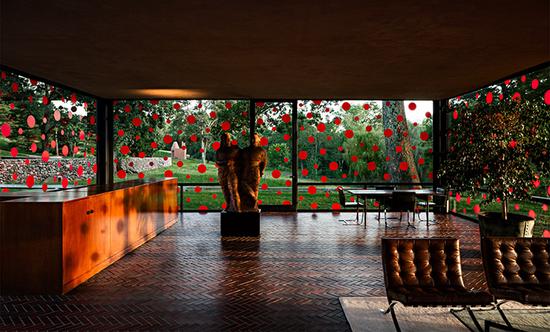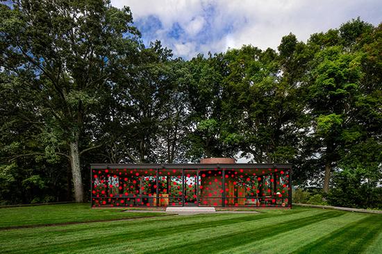 在这座美国著名建筑师 Philip Johnson 1940 年代为自己设计的现代主义居所中,一项名为“迷恋波点——活着,追寻永恒的希望”(Dots Obsession – Alive, Seeking for Eternal Hope)的艺术作品持续了一个月的时间。