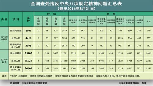 数据显示,2016年8月全国查处违反中央八项规定精神问题2901起,处理4416人。其中乡科级干部违反中央八项规定精神问题比较严重,达到2489件。另外,“违规发放津补贴或福利”情况最为严重,达到746件。