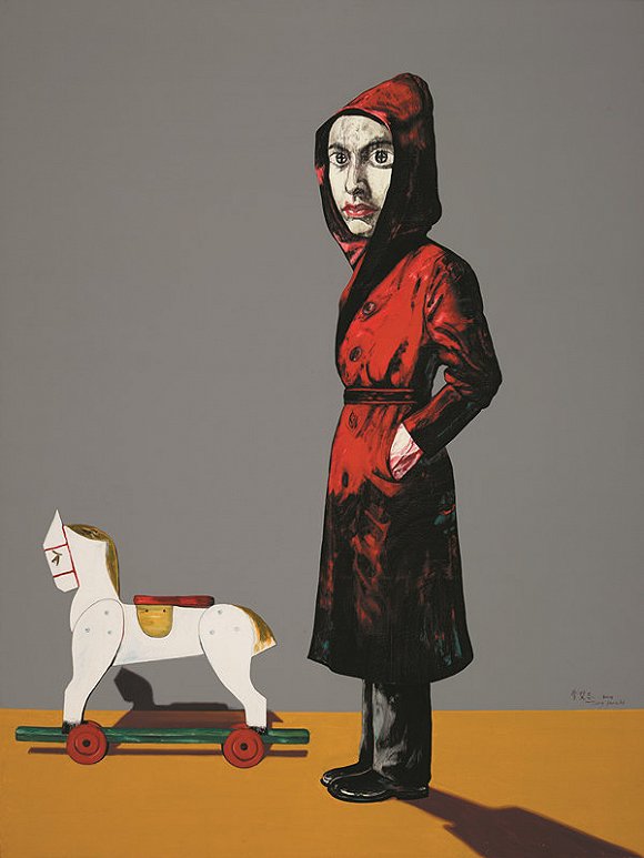 上世纪80年代末、90年代早期,曾梵志围绕日常生活中的肉体画过嘲世、轻松的“协和医院”系列。“戴上面具”是在1994年。那时候,曾梵志从武汉迁居北京,没有户口的他常遭居委会盘查,他觉得自己仿佛戴了个面具,真实的自我必须遮蔽起来?!?因此有了“面具”里的人物:他们表情僵硬,指节硕大,似乎在指涉当代社会里普遍的异化状态。