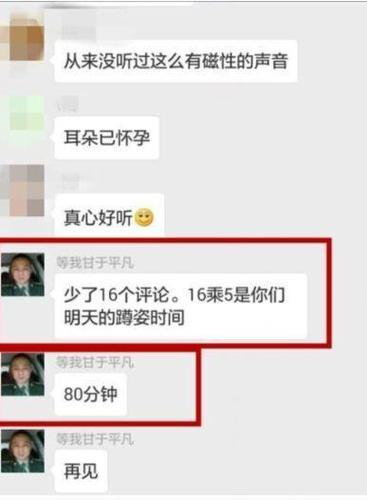 此外,另一名学生赵鹏(化名)向记者出示一个微信群的几张截图,一张截图中一个穿军装头像男子发了一张露出自己大腿的图片,然后说“你们能用美丽语言来形容一下我的腿吗?”,另一个截图中,该男子说,“少了16个评论,16乘5是你们明天蹲姿时间,80分钟,再见。”赵鹏说,该男子就是总教官,他让大家夸自己的腿,夸得好可以免受体罚,夸得不好就直接体罚。