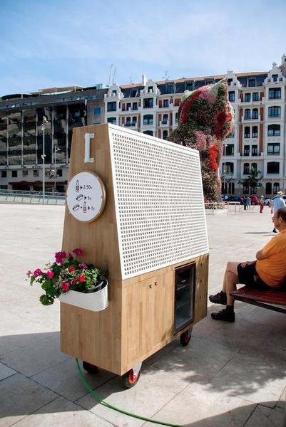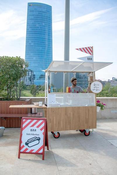 这个叫作“The Salchibotxo”的小餐车,专卖用毕尔巴鄂本地香肠制作的热狗以及本地啤酒。小车体积不大,一个操作台、一个储藏柜、一个烤箱、三个小抽屉就是全部。对了,还有店主做的一些小装饰,包括用图画表达的菜单、一盆小花、两面充当招牌的小旗,以及一串用于夜间照明的圆珠灯泡。