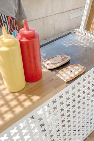 除了好看,这个车在功能性上也做了充足的考量。首先,从储藏量来说,这辆小车可以储存150瓶啤酒及500根香肠,完全能应付古根海姆博物馆每天的客流。再来,操作面板上的烤盘,或是藏在车体下部的烤箱,能同时进行加热工作,使得一个工作人员也能高效产出,而且台面上的操作还能成为吸引人流的利器。另外,这辆小车还配备了立体环绕声音响。当音乐响起,人流自然就会聚集起来,可以避免车子太小,客流容易注意不到其存在的潜在问题。
