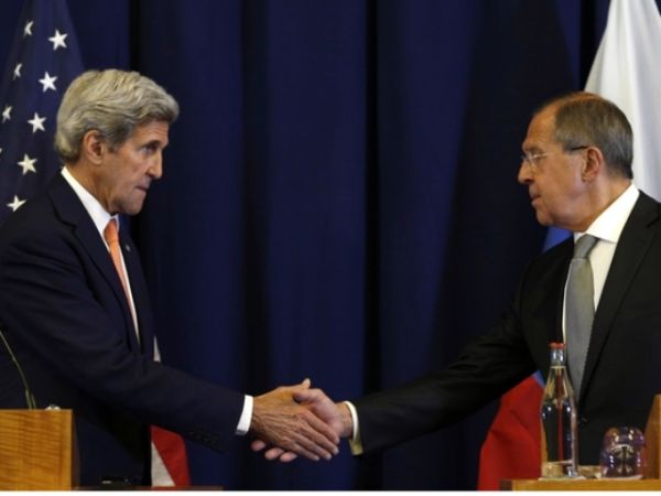 资料图:2016年9月9日,瑞士日内瓦, 美国国务卿约翰·克里(左)与俄罗斯外交部长谢尔盖·拉夫罗夫在新闻发布会上握手。(新华/美联)