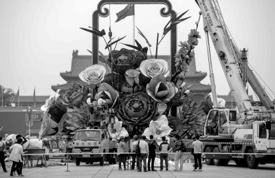 天安门国庆大花篮初露真容 插花借助3D技术定位