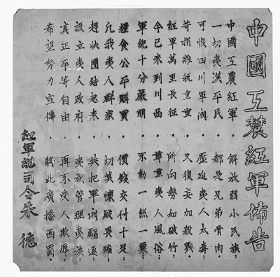 1935年5月,为宣传民族政策,保证部队顺利通过彝族区,抢渡大渡河,由陆定一撰写、红军总司令朱德签署印制的《中国工农红军布告》。