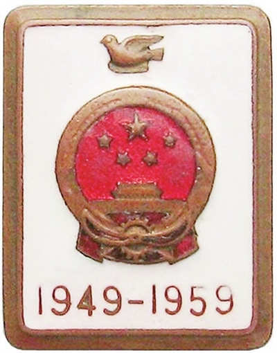 国庆10周年徽章 1959年国庆十周年,全国举行隆重庆典,制作了大量纪念章。这些纪念章中有的出现了“飞马”“龙腾”“和平鸽”等图案,内涵十分丰富,成为火热年代的真实写照。如国庆10周年纪念徽章,铜质,长方形,高23厘米,宽8厘米,上绘展翅奋飞的和平鸽,中绘鲜艳的国徽,下绘“1949—1959”的数字,表明是国庆十周年。图案简洁美观,具有纪念意义。