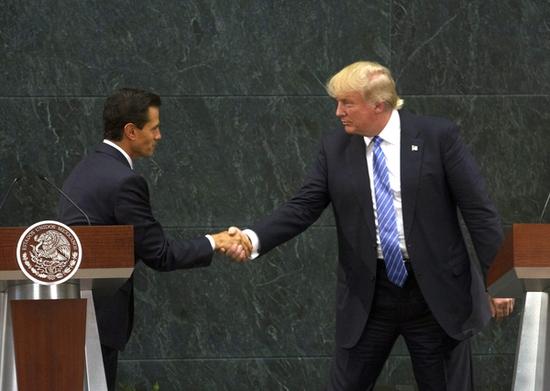 资料:2016年8月31日,墨西哥城,培尼亚(左)与特朗普出席联合新闻发布会。(新华/欧新)