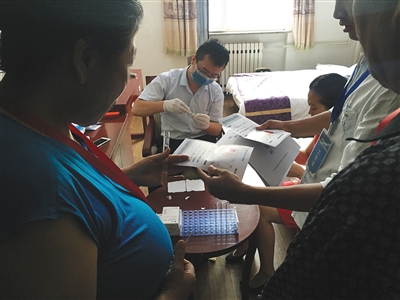 8月23日,六渡某酒店,早饭前,会销督导在房间内给老人们做尿检筛查癌症。