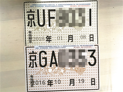 9月19日,北青报记者和对方商定,以1100元的价格购买两个月的临时号牌。20日下午,对方通过中通快递送来了两副棕底黑字的临时号牌。其中一副签发时间为9月19日,有效期至10月19日;另一副签发时间为10月19日,有效期至11月19日。