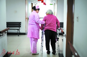 广州某老年公寓,医护人员陪老人散步。(资料图片) 广州日报记者莫伟浓 摄