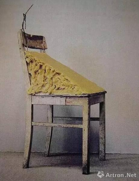 我们再来看一看德国当代艺术大师约瑟夫博伊斯的《油脂椅子》。这件被称为艺术品的东西,是在一把破旧的椅子上涂抹了许多油脂,椅子上还有一段铁丝。