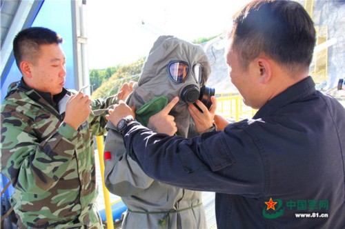 专业人员带领记者在气密室检查防毒服气密性情况。周灯华 摄